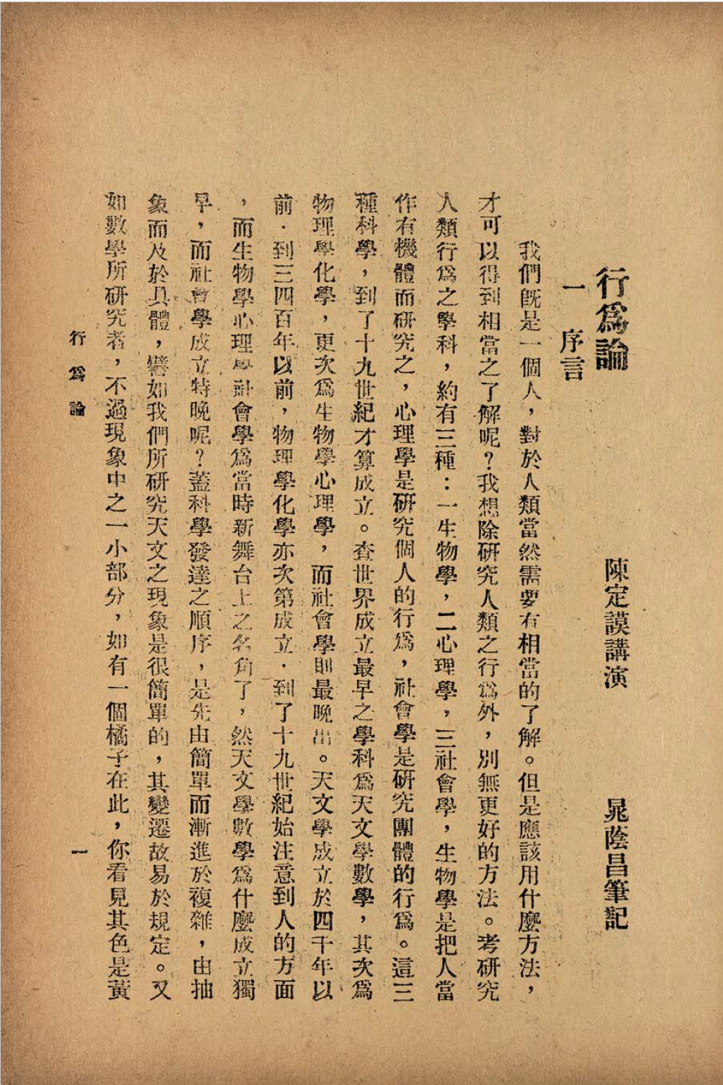 《行为论》 陈定谟讲演;晁荫昌笔记